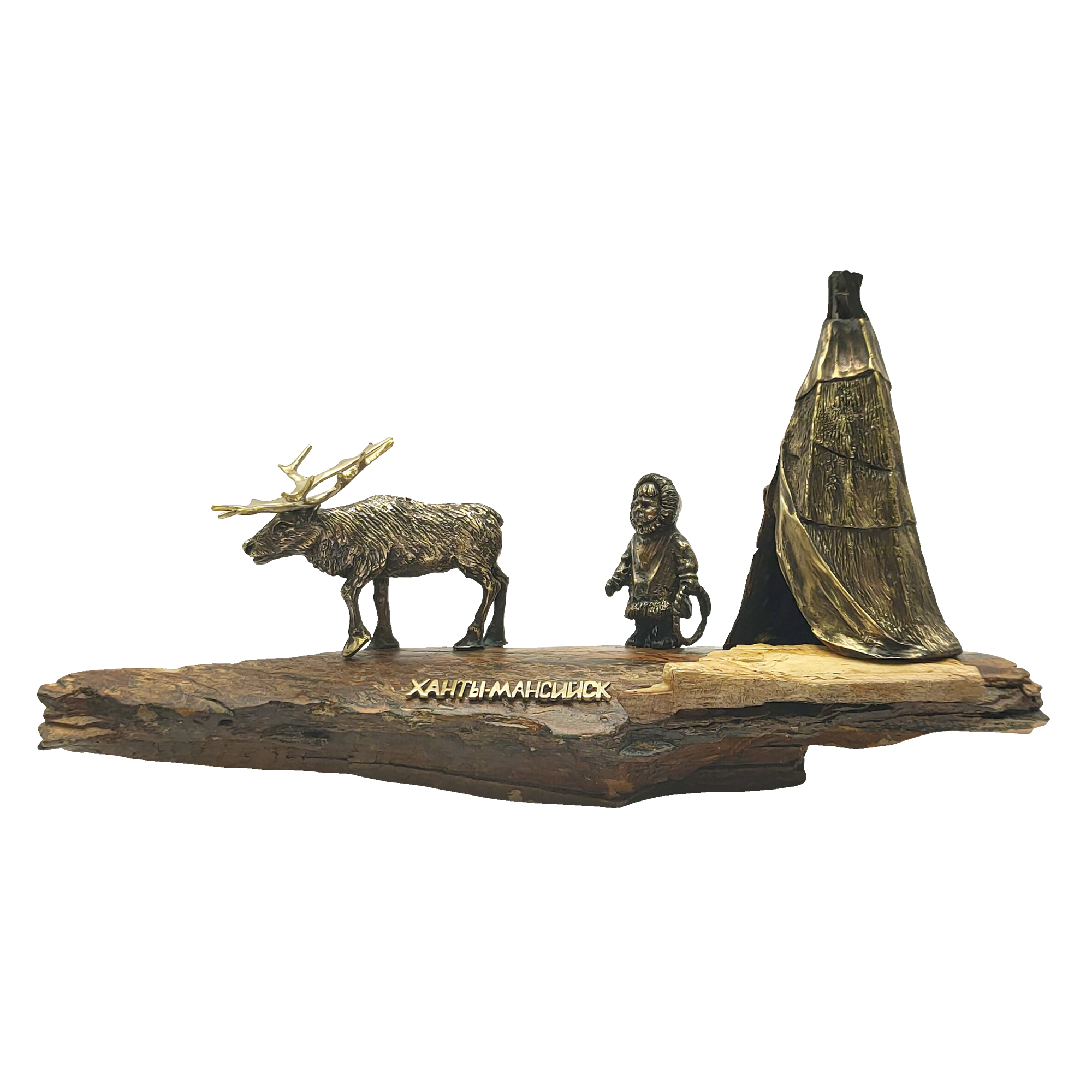 ЛМ Коренной житель с оленем у чума, латунь, подставка бивень